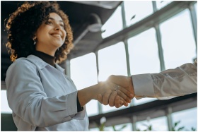 A smiling woman with curly hair shaking hands in a