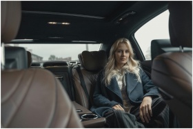 Elegant woman in a blue coat sitting in the back seat of a luxury car.