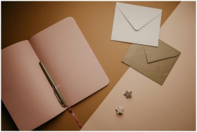 A stylish flat lay featuring an open notebook, envelopes, and a pen, perfect for stationery enthusiasts.