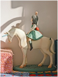 Colorful figurine of a girl riding a unicorn, capt