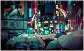 Explore Shibuya's bustling nighttime streets with neon lights and umbrellas amidst the rain in Tokyo, Japan.