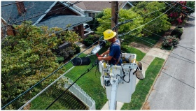 Electrician in a bucket lift repairing power lines from a utility pole in a suburban neighborhood.