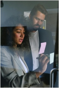 Team discussing strategy in a contemporary office, brainstorming with sticky notes.