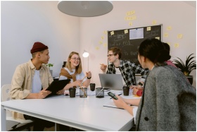 Young professionals collaborating in a modern office setting, fostering teamwork and innovation.