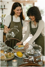 Positive female colleagues wearing aprons standing at table with glass dome lids and various desserts while working in modern cafeteria