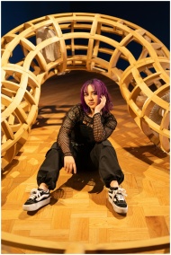 Stylish woman in mesh top sitting in unique wooden art installation, vibrant lighting.