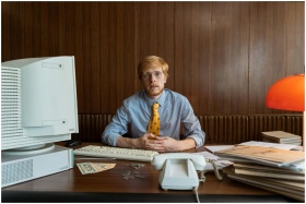 Retro office scene with businessman in tie at desk, featuring vintage computer and files.