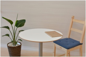 A sleek minimalist office space featuring a table with a laptop and a potted indoor plant beside a wooden chair.