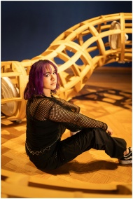 Young woman with vibrant purple hair posing in front of modern sculpture indoors.