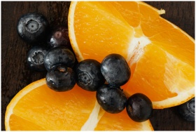 From above organic blueberries scattered on halves of ripe orange on lumber table prepared for raw breakfast