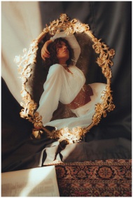 A woman in vintage attire reflected in an ornate gold mirror, creating an artistic, dreamy composition.