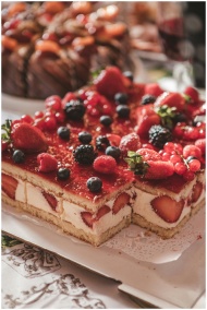 Enticing layered cake topped with fresh berries, p