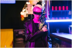 Stylish cyberpunk woman in dark room with futuristic eyewear and tech weapon.
