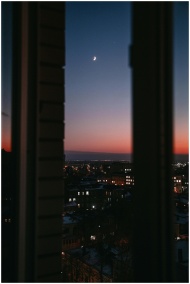A beautiful cityscape at dusk framed by a window, featuring a crescent moon and vibrant evening sky.