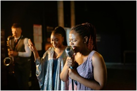 Vocalist sings passionately with saxophonist in a lively jazz performance.