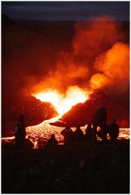 People watching a spectacular volcanic eruption at night with flowing lava and eruptive smoke.