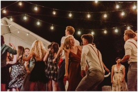 A lively outdoor night party with people dancing under string lights.