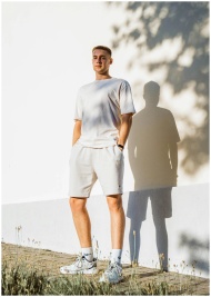 Young man in casual attire stands against a wall, casting a shadow in the summer sun.