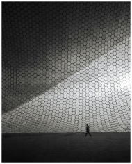 Black and white architecture showcasing Soumaya Museum's hexagonal tiles with a lone silhouette.
