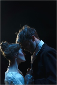 A dramatic and intimate portrait of a romantic couple embracing on stage under spotlight.