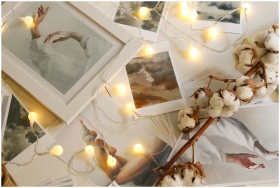 A collection of framed art pieces, cotton flowers, and string lights creating a cozy atmosphere.