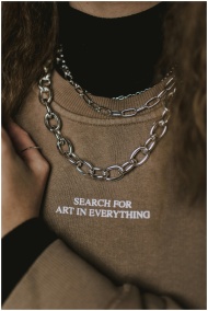 Close-up of a beige sweatshirt with a silver necklace and art slogan.