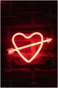 Bright neon heart with arrow sign on a rustic bric