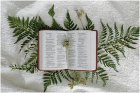 An open Bible displayed on a bedspread surrounded by fern leaves, symbolizing faith and nature.