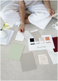 Designer sits on carpet with color palettes and samples, planning creative project.