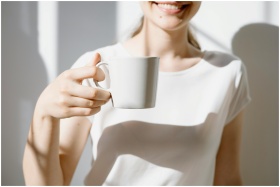 A smiling woman holds a white coffee cup in natura