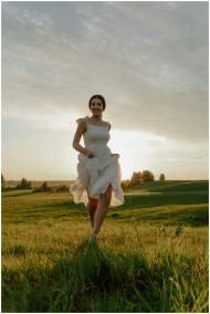 A woman joyfully runs through a sunny meadow, capturing the essence of summer freedom.