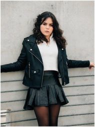 Young woman leaning on fence in stylish black leather jacket, exuding confidence.