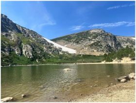 Breathtaking view of a mountain lake surrounded by rocky peaks in Colorado.