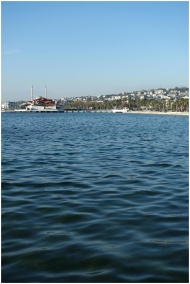 Serene view of the Büyükçekmece coastline with clear blue waters and cityscape in Istanbul, Turkey.