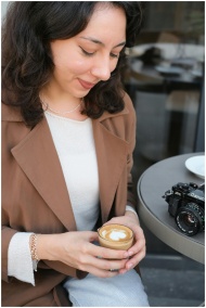 A woman savoring cappuccino at an outdoor cafe in Büyükçekmece, Istanbul.