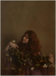 A captivating renaissance-style portrait of a woman with curly hair and floral elements.
