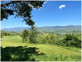 Beautiful landscape view of the green hills and countryside in Poppi, Tuscany, under a clear blue sky.
