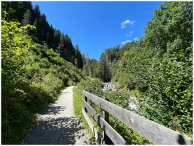 Sunny mountain trail with lush greenery in Trentin