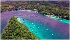 A scenic aerial view of Sukakarya's vibrant coastline and lush forests in Aceh, Indonesia.