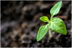 Vibrant close-up of a young tomato seedling sprouting in the soil.