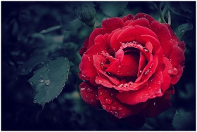 Close-up of a vibrant red rose adorned with fresh dewdrops, capturing natural beauty.