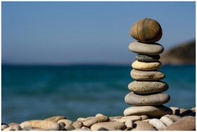 A stack of balanced stones on a beach with a tranq