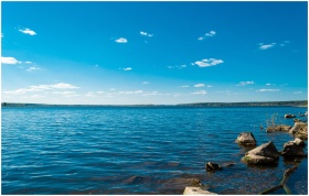 Serene view of a blue lake with rocky shore under