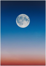 A serene full moon set against a gradient twilight sky, blending hues of blue and orange.