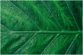 Close-up of a green leaf with water droplets, highlighting natural texture and freshness.