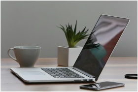 Minimalist home office desk with laptop, smartphone, and plant for a modern work environment.