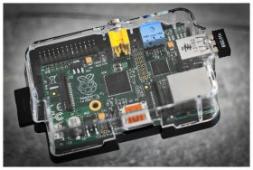 Detailed image of a Raspberry Pi microcomputer circuit board in a clear case.
