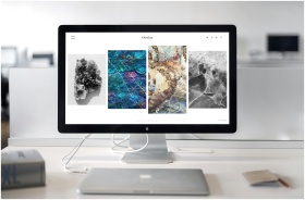 A contemporary office desk setup featuring a sleek computer monitor displaying abstract artwork.