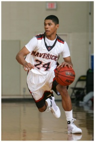 A young male basketball player dribbles on an indoor court wearing a Maverick jersey.