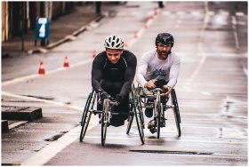 Two men compete in a wheelchair race on a wet urban street, showcasing endurance and teamwork.